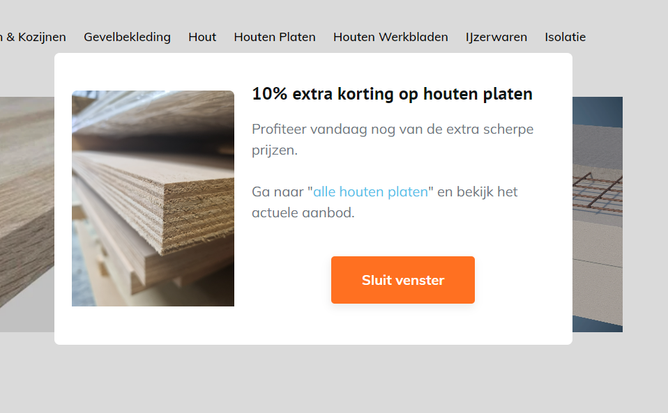 Een Pop-up voor extra aandacht. In dit geval voor een 10% kortingsactie.